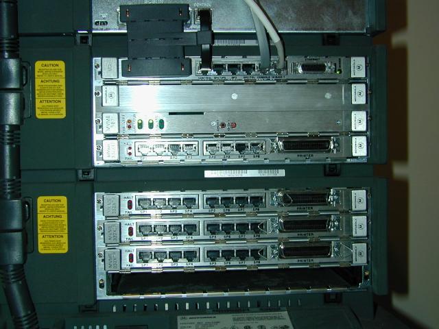 Pictures of a Motorola 900 modular chassis, with a 33MHz MVME187 CPU board, 32MB RAM, 4 MVME332XT serial boards, and an Archive 250MB QIC tape drive.