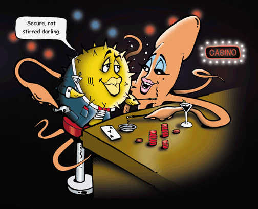 We could not decide who should live, so there are two versions of this shirt. Shirt #35 is a Black T-shirt where the Black Spyfish wins; Shirt #36 is a White T-shirt where the White Spyfish wins. When purchasing, choose carefully based on the outside border of the image (or, the colour of the spy who lives). Unfortunately this creates a dilemma if you would prefer to wear a black shirt but have the White Spyfish (obviously representing yourself) live. But then, isn't everything a dilemma these days?